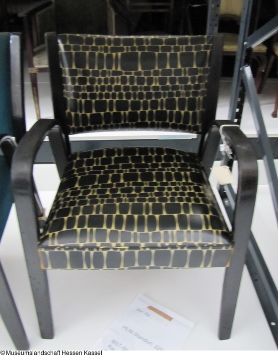 Armlehnstuhl mit schwarz-weiß gemustertem Plastik-Bezug