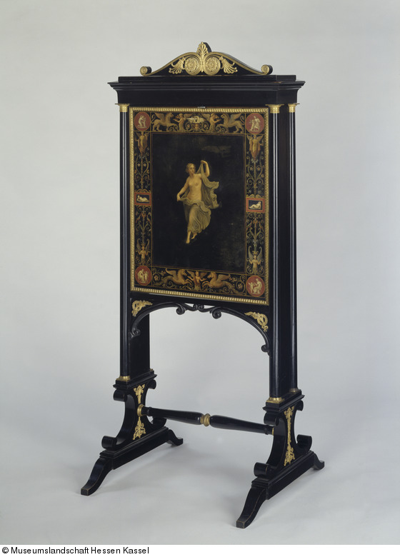 Der preußische Baumeister Karl Friedrich Schinkel (1781-1841) entwarf auch Innenarchitekturen und raffinierte Möbel. Der wandelbare Patentsekretär erinnert in der Form an einen Kaminschirm und konnte geöffnet als kleines Schreibmöbel genutzt werden. Der Sekretär hat entgegen dem üblicherweise mit Stoff bezogenen Rahmen eine aufklappbare, mit Leder ausgelegte Schreibplatte. Die mit einer Blechplatte belegte Front wurde mit Lackmalerei der Berliner Stobwasser Werkstatt im Stil pompejanischer Wandmalerei gestaltet. Im Salon des Biedermeier dienten solche Kleinmöbel sowohl praktischen Zwecken als auch der Zierde und ergänzten die sonst sparsame Möblierung.