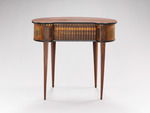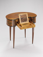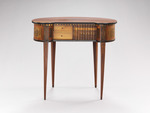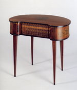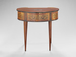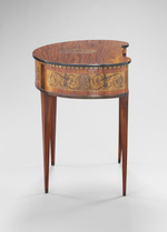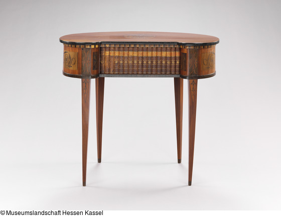 Den Bedürfnissen der immer raffinierter werdenden Lebensformen in der zweiten Hälfte des 18. Jahrhunderts folgend, wird eine Fülle neuer Möbelformen entwickelt. Architekten und Dessinateure entwerfen Kleinmöbel, die leicht beweglich auf Rollen laufend oder leicht zu tragen überall im Raum nach Bedarf zum Einsatz kommen. Dazu gehören auch Lesetischchen, die an einen günstig beleuchteten Platz oder an den Kamin gestellt werden können. Das kleine, bohnenförmige Tischchen auf hohen, schlanken Beinen verrät seine Funktion an der Front: Bücher scheinen griffbereit aufgereiht zu stehen. Tatsächlich verschließt das aus Bücherrücken hergestellte Rouleau zwei übereinander liegende Schubladen mit Inneneinteilungen. Das Möbel hat ein Gegenstück, das zum Besitz Karl Friedrich von Erthal (1719-1802), Kurfürst von Mainz, gehörte und sich heute im Schlößchen Schönbusch in der Nähe von Aschaffenburg befindet (s. Kreisel, Bd. 3, 1978, Nr. 158).