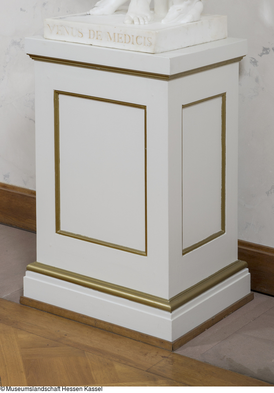 Auf rechteckigem Grundriß Sockel mit hochrechteckiger, profilierter Kassette auf jeder Seite. Profilierte Fuß- und Deckplatte.