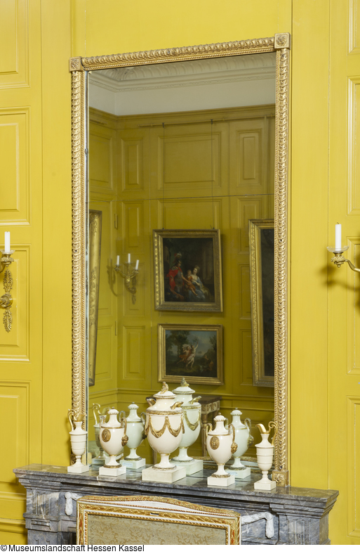 Spiegelglas. Holz, geschnitzt und vergoldet. |