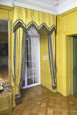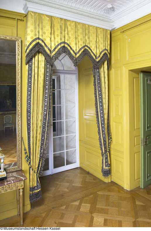 Linker Schal einer Gardine. Gelbe, mit Sternen und Rosetten gemusterte Seide. Futter aus cremeweißer merzerisierter Baumwolle. Schwarze, aufgenähte Borte aus stilisierten Blättern im Wechsel mit kelchförmigen Blüten. Schwarze Randborte mit Rankenwerk und Sternrosetten. Schwarze, 14 cm lange Posamente aus sechs Gliedern. Schal hängt an einer Gardinenstange.