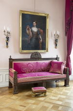 Die Gruppe stand ab 1823 im Mittelbau von Schloss Wilhelmshöhe, Bel Étage, Rotes Wohnzimmer. Nach Auftrag von Kurfürst Wilhelm II. lieferte Johann Conrad Bromeis den Entwurf, die Ausführung erfolgte durch den Kasseler Schreinermeister Carl Lauckhardt. Der Seidendamast kam aus Lyon, die vergoldeten Bronzen aus Paris.