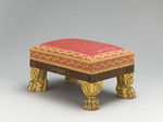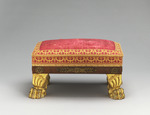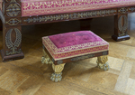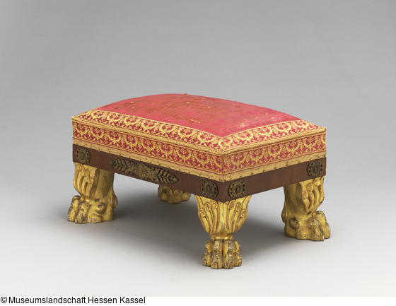 Rechteckige, gepolsterte Fußbank auf 4 Beinen, deren Füße als Löwentatzen gestaltet sind. Der Ansatz der Beine zur Zarge hin mit geschnitzten Volutenranken. Glatte Zarge mit Bronzebeschlägen: auf den Längsseiten mittig Rosette mit seitlichen Blattstäben, die in Zapfen enden. An den Ecken je zwei Rosetten, die seitlich von einem kleinen Blattmotiv umfangen werden.