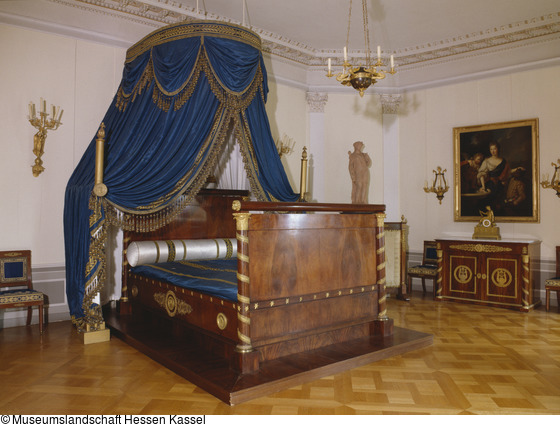 Das Bett gehörte zu den Möbeln, die ab 1823 im Mittelbau von Schloss Wilhelmshöhe, Bel Étage, südliches Schlafzimmer standen. Entwurf wohl wie bei den anderen Stücken von Bromeis, Ausführung von Siebrecht, Bronzen aus Paris.