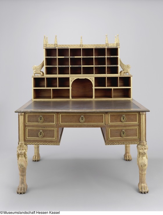 Längsrechteckiges, dreigeschossiges Briefrepositorium zu je sechs offenen Gefachen. Das schlichte Eichenkorpus an der Frontseite vergoldet. Rückwand Weichholz. Auf der Oberseite eine niedrige, geschnitzte Galerie, die nach vorne in der Mitte offen ist. An den Eckpunkten würfelförmige Pfeilerchen, die zu jeder Seite mit vergoldeten Kreuzen versehen sind und vergoldete Pyramiden tragen, die wiederum von einer stilisierten Eichel(?) bekrönt werden. Dazwischen geschnitzte Leisten mit geometisch verwobenen Zickzackbändern, und fortlaufender Kreuzblumenfelderung. Die Gefache teilweise mit kleinen schwarzlackierten Blechschildchen versehen, die in goldenen Majuskeln die Namen verschiedener hessischer Regimenter tragen. Obere Reihe: 1. ''CARABINIERS''; 2. ''GARDE DU CORPS''; 3. leer (Schild entfernt); 4. leer (Schild entfernt); 5. ''REG: LANDGRAF FRIEDR: DRAG:''; 6. ''HUSAREN''. Mittlere Reihe: 7. ''SCHWEIZER LEIB=GARDE''; 8. und 9. ''GARDE''; 10. ''GARDE-GRENADIER''; 11. ''REG: KURFÜRST''; 12. ''REG: KURPRINZ''. Untere Reihe: 13. ''REGIM: LANDGRAF CARL''; 14. ''RIESENRODT''; 15. ''WURMB''; 16. leer (Schild entfernt); 17. ''BRIGADE LEICHTER TRUPPEN''; 18. ''ARTILLERIE''. Diese Schilder gehören vermutlich nicht zur Erstausstattung des Möbels, da sich auch noch zahlreiche Nagellöcher älterer Herstellung finden. Biehn glaubt an eine Bezeichnung nach Erlangung der Kurwürde und vor der napoleonischen Zeit. Da die Ornamentik mit jener am Schreibtisch Inv.Nr. 2.3.118 und der Repositur Inv.Nr. 2.7.623 nicht exakt übereinstimmt, ist ein getrennter Entstehungszusammenhang anzunehmen. Dennoch korrespondiert das Ornament des Stückes mit dem Kaminschirm Inv.Nr. 2.7.620, so daß eine Herstellung mit Blick auf die Einrichtung der Löwenburg als sicher gelten muß. Schließlich findet sich die Repositur auch im Inventar von 1816 (StAM 7 i Inventar 74): ''Zwey kleine Reposituren, die eine mit 11, die andere mit 18 Gefachen von dergleichen Holz [= ''fernifiertem Eichenholz'']'' mit vergoldeter Bildhauerarbeit und 2 geflügelten Löwen.''