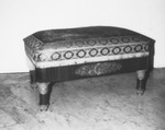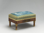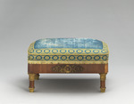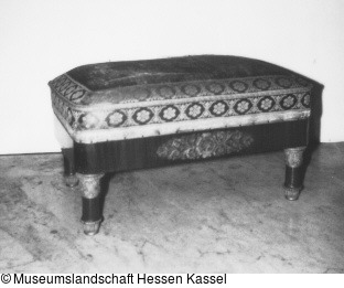 Rechteckige Fußbank auf vier konischen, gedrechselten Beinen mit kanneliertem Bronzeschuh und Blattkapitell. Die niedrige Zarge weist gerundete Ecken auf. Auf den Längsseiten der Zarge ist eine Sternrosette mit Blattkranz und seitlichen Blütenzweigen in vergoldeter Bronze montiert. Hohes Polster mit einem Bezug aus blauem Seidendamast. An den Rändern doppelreihige blau-gelbe Borten mit Rosetten und Ranken. Alte Bezeichnung: Schloß Wilhelmshöhe Z. 50 Nr. 11. Inv.Verz. Wilhelmshöhe Bd. Ia S. 152.