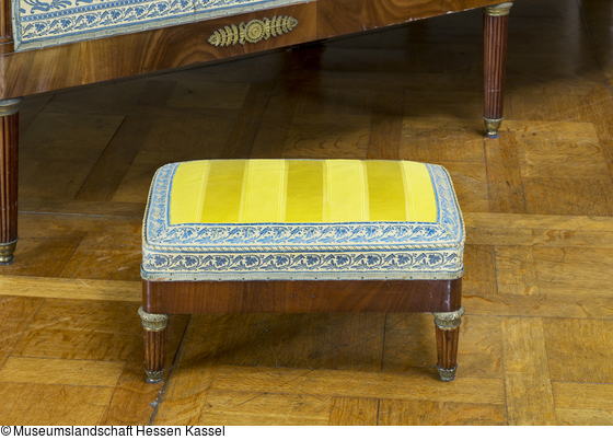 Rechteckige, gepolsterte Fußbank auf 4 gerippten und leicht konisch zulaufenden Rundbeinen. Bronzeschuhe der Beine mit stilisiertem Blattdekor, Bronzekapitelle mit Blatt- und Eierstabdekor. Glatte, gerade, an den Kanten gerundete Zarge. Das Polster der Fußbank mit Bezug aus gelb-gestreifer Seide, umrahmt von breiter Borte aus stilisierten Lotosblumen und Blättern.
