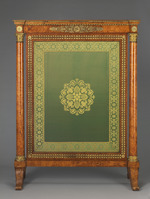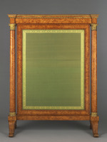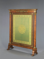 Ofenschirm auf vier s-förmig gebogten Füßen, die in Voluten enden und mit Mahagonileisten abgesetzt sind. Seitlich je eine hohe Rundsäule mit bronzenen Basen und Kapitellen. Architravartiger oberer Abschluß mit verstärkten Ecken, die je zwei bronzene Sternrosetten aufweisen. Mittig auf der Vorderseite eine große Blütenrosette mit seitlichen Zweigen aus Akanthus- und Palmettenblättern. Gestufte Gesimsplatte mit bronzenem Eierstab und Blattfries. Der profilierte Rahmen der Ofenschirmbespannung auf der Vorderseite weist in den Ecken kleine Blattrosetten und an den Seiten Weinblattzweige in vergoldeter Bronze auf. Die Bespannung besteht aus grünem Seidendamast mit einer großen gelben Sternrosette aus Palmettenblättern im Zentrum, die von einem Akanthusblattkranz umgeben ist. Umlaufend grün-gelbe Borte mit gegenständigen Palmettenblättern und Akanthusranken, dazwischen einzelne Rosetten. Die Rückseite des Ofenschirms ist mit grünem Seidendamast bespannt und weist eine schmale grün-gelbe Borte auf.