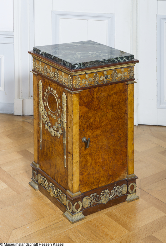 Bemerkung: Gegenstück Inv.Nr. SM 2.7.444. Die beiden Nachtschränke standen ursprünglich im Schlafzimmer des Weißen Palais (Residenz Palais) in Kassel. Die Entwürfe zur Inneneinrichtung sind wohl Bromeis, Johann Conrad zuzuschreiben.