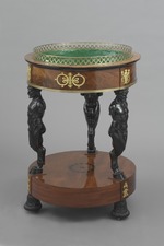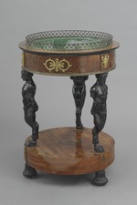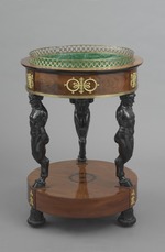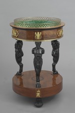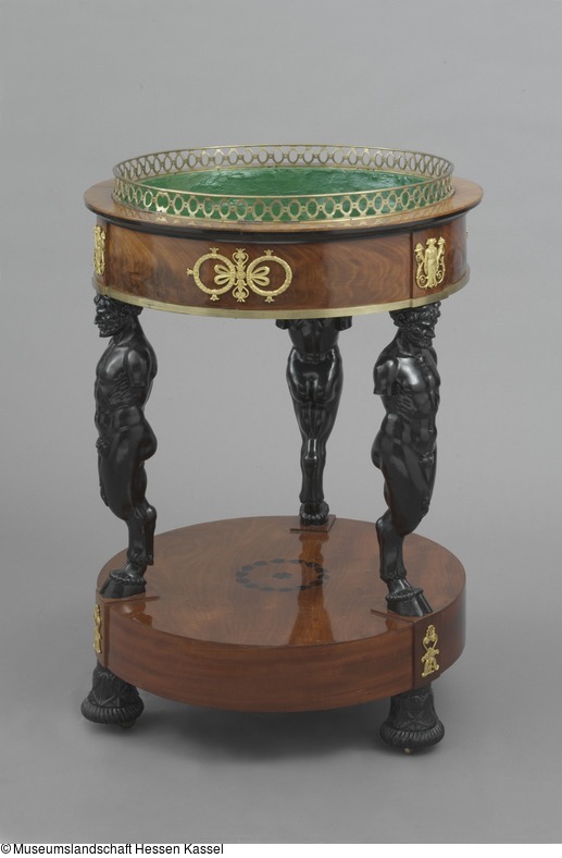 Runder Blumentisch (Jardinière) mit einer hohen Sockelplatte auf drei geschnitzten schwarzen umgedrehten Lotoskapitellen mit Eisenrollen, die Durchdringungsstelle vorspringend und mit Bronzebeschlag in Palmettenform belegt. Oberseite dieser Platte in der Mitte mit schwarzer kreisförmig marketierter Lorbeerblatt- Einlage. Drei, auf je einem doppelzehigen geschnitztem Huf stehende Silenshermen mit abgeschnittenen Oberarmen tragen den Blumenkasten, der durch ein kräftiges Bronzeband zusammengehalten ist. Über den Hermen an den vorspringenden Stellen Beschläge in Palmetten auslaufende flammende Füllhörner tragende Silensgestalten, dazwischen Doppelkranzbeschläge um eine Palmettenachse mit Schleifen gebunden. Durchbrochener Bronzekranz mit ovalen Gliedern als Abschluss 4 cm hoch über profiliertem Rand.