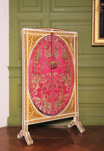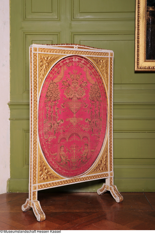 Ofenschirm mit geschnitztem, weiß und gold gefaßten Rahmen. Über geschwungenen Füßen mit Akanthusblattschnitzerei rechteckiger Rahmen, der mit Bandornament und Rosetten verziert ist. In den Zwickeln zwischen Rahmen und ovaler Stoffbespannung Akanthusschnitzerei.