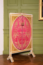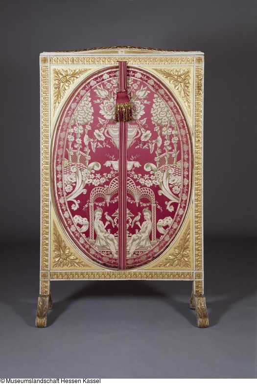 Das ovale Bildfeld mit einer Bordüre besetzt, die ein Blumenrankenmuster zeigt. Bezugsstoff des Schirms aus chinoisem Seidenlampas, welcher der Wandbespannung Kat. Nr. 55 entspricht.