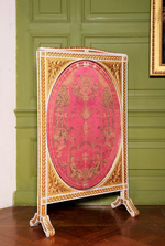 Ofenschirm mit geschnitztem, weiß und gold gefaßten Rahmen. Über geschwungenen Füßen mit Akanthusblattschnitzerei rechteckiger Rahmen, der mit Bandornament und Rosetten verziert ist. In den Zwickeln zwischen Rahmen und ovaler Stoffbespannung Akanthusschnitzerei.