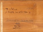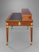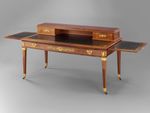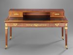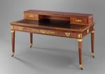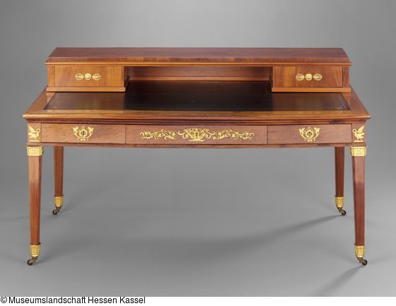 Flacher, langgestreckter Schreibtischaufsatz mit je einer seitlichen Schublade und offener Mitte. Fronten der Schubladen mit vergoldeten Beschlägen: mittig Knopf mit Reliefdekor, seitlich symmetrisch angeordnet stilisiertes Palmettenmotiv. Einfache rechteckige Abdeckplatte über vorkragender profilierter Kranzleiste. Auf der Unterseite der linken Schublade beschriftet: Fr. Wichmann zu Cassel den 25ten Febr. 91.