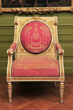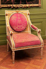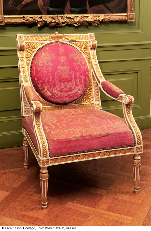 Sessel mit geschnitztem, weiß und gold gefaßten Rahmen. Über kleinen gedrungenen Füßen vier kannelierte, nach unten konisch verjüngte Säulenbeine, die oben und unten mit einem Blattfries verziert sind und unterhalb des Zargenansatzes eine Kehle aufweisen. Die Zarge als gerader Fries aus stilisiertem Akanthus geformt, an den Ansatzstellen der Beine hervorgehobene, quadratische Blattrosetten. Am oberen Teil der geschwungenen, gepolsterten Armlehnen Festons, am unteren Flechtbandschnitzerei. Rechteckige Rückenlehne mit ovalem Polster. Der Rahmen mit Bandornament und Rosetten verziert, die Zwickel des Rahmens mit Akanthusschnitzerei, in der oberen Mitte ein Vasenmotiv mit Festons. Die hohen Polster von Sitzfläche und Rücken seitlich mit breiter Bordüre besetzt, die ein Blumenrankenmuster zeigt. Bezugsstoff der Flächen aus rotem chinoisem Seidenlampas, welcher der Wandbespannung in Schloss Wilhelmsthal, 1. Obergeschoss, ehm. Schlafzimmer, Südwohnung entspricht.
