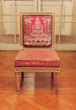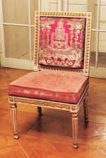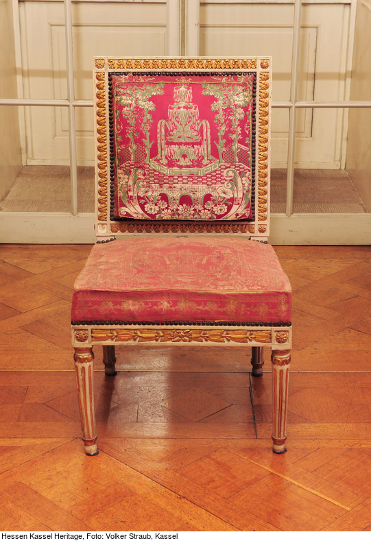 Stuhl mit geschnitztem, weiß und gold gefaßtem Rahmen. Über kleinen bauchigen Füßen vier kannelierte, nach unten konisch verjüngte Säulenbeine, die oben und unten mit einem Blattfries verziert sind. Die Zarge als gerader Fries mit waagerechten, durch Schleifen verbundene Lorbeerranken geformt, an den Ansatzstellen der Beine hervorgehobene quadratisch gerahmte Rosetten. Rechteckige Rückenlehne mit rechteckigem flachen Polster. Der Rahmen mit Kelchblattornament und Rosetten verziert. Die hohen Polster der Sitzfläche seitlich mit breiter Bordüre besetzt, die ein Blumenrankenmuster zeigt. Bezugsstoff der Flächen aus rotem, chinoisem Seidenlampas, welcher der Wandbespannung in Schloss Wilhelmsthal, 1. Obergeschoss, ehem. Schlafzimmer, Südwohnung entspricht.