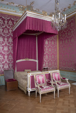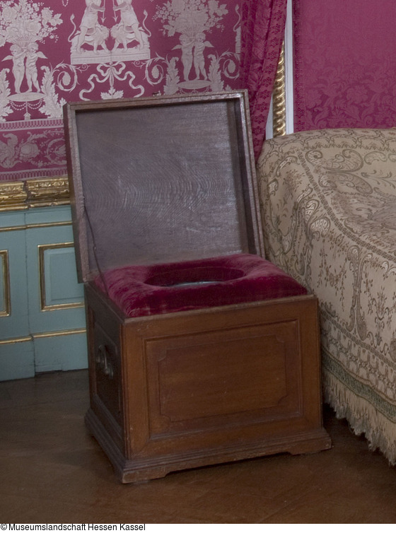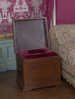 Schlichter würfelförmiger Nachtstuhl aus lasiertem Eichenholz. An der linken und der rechten Seite befindet sich je ein Tragegriff. Der Deckel ist aufklappbar. Das Nachtgefäß hat ein großes Fassungsvermögen und besteht aus einer Zinnlegierung. Die Sitzfläche ist mit rotem Samt gepolstert.