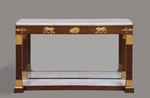 Mahagoni über Eiche, feuervergoldete Bronzen, Eisen, grau-geäderter weißer Marmor, Spiegel |