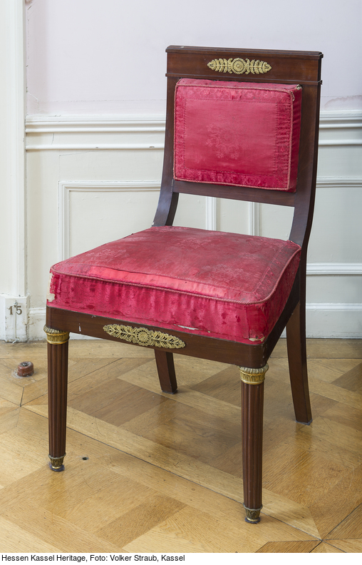 Bemerkung: die zusammengehörige Sitzgruppe aus 12 Polsterstühlen (2.1.1307 - 2.1.1311 und 2.1.1931 - 2.1.1937) befand sich 1828 im Coursaal des Residenz Palais, Kassel.
