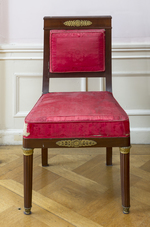 Gerippte, sich nach unten verjüngende Vorderbeine mit kelchförmigen Bronzeschuhen und stilisierten, bronzenen Kapitellen. Vierkantige, nach hinten leicht ausschwingende Hinterbeine. Glatte, an den vorderen Ecken gerundete Zarge, an den Seiten leicht hochgezogen. Trapezförmiger Polstersitz. Wenig nach außen geschwungene, oben gerade Lehne mit Rückenlehnpolster und breitem, mit einer Leiste abgesetztem Lehnenhaupt. Oberer Abschluß aus drei Stäben. Auf der vorderen Zargenleiste und dem Lehnenhaupt applizierter Bronzebeschlag, eine Rosette mit Blattwerk zeigend. Roter Seidendamast mit dem Rapport kleiner und großer Sternrosetten, umlaufend florale Randborten.
