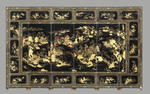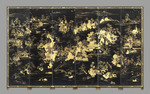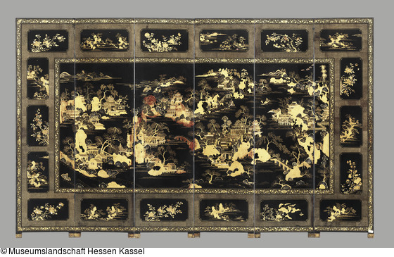 Sechsteiliger hoher Holzparavent mit Schwarzlackgrundierung und Malerei in Gold- und Silber-Hiramakie. Beidseitig bemalt. Seite A: Rundumlaufender breiter Rahmen aus einem floralen arabesken Fries an den Rändern und einem geometrischen Grundmuster dazwischen, aus dem vierpassige Kartuschen mit Blütenzweigen und Miniaturlandschaften ausgespart sind. Die große Mittelzone des Paravents füllt eine weitläufige Palastarchitektur, die sich um eine Seenlandschaft gruppiert und sich teilweise in sie hineinzieht. Vereinzelt auftretende Personen spielen eine untergeordnete Rolle.