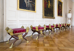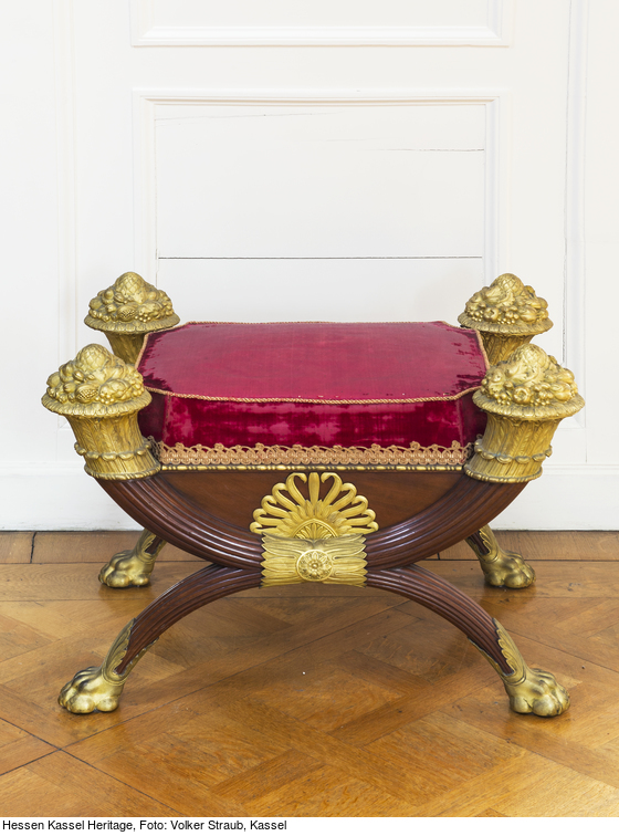 Bemerkung: Die zwölf Taburetts (Inv.Nr. 2.1.1848 - 2.1.1859), deren Entwurf auf Johann Konrad Bromeis zurückgeht, standen 1823 im Coursaal des Residenz Palais zu Kassel. Die um den Thronsessel, Inv.Nr. 2.1.1847, erweiterte Sitzgruppe stand um 1831 im Thronsaal des Residenz Palais zu Kassel, Raum 128.