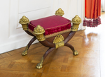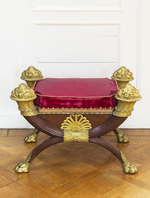 Mahagoni, geschnitzt und gedrechselt. Bronzebeschläge, vergoldet. Sitzpolster mit rotem Samt überzogen. |