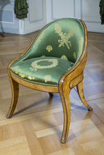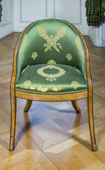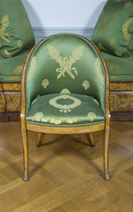 Vorder- und Hinterbeine des Sessels vierkantig und nach vorne bzw. hinten ausschwingend. Allseitig gebauchte, glatte Zarge, die mit aufgelegten Rundleisten aus Mahagoni zusätzlich angedeutet ist. Die gebogten Vorderbeine gehen in die hohe, schalenförmige Rückenlehne über. Sitz- und Rückenlehnpolster aus grüner Seide mit gelb gewebtem Muster: gekreuzte, schleifengebundene Fackeln bzw. floraler Kranz, dazwischen stilisierte Palmetten.