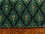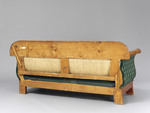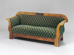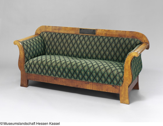 Sofa auf vier Brettfüßen stehend. Glatte Zarge. S-förmig geschwungene Seitenlehnen. Erhöhte Rückenlehne mit geradem Kantenabschluß und gerundeten Ecken. Mittig querrechteckiger Leistenrahmen mit schwarz gebeizter Holzfüllung. Polstersitz, Seiten- und Rückenlehnenpolster mit grünem Baumwollripsbezug, der schwarz gerahmte Rautenfelder mit stilisierten beigefarbenen Zweigen aufweist. Seiten der Wangen mit gleichem Bezugsstoff verkleidet. In blauer Handschrift bezeichnet ''332/9''.