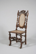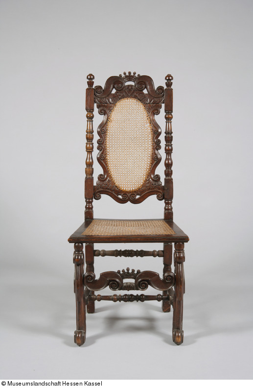 Rohrstuhl in einer Mischung von Drechsel- und Schnitzarbeit des späten 17. Jahrhunderts. Auf trapezförmigem Grundriß, volutengeschwungene Vorderbeine, verbunden mit bekrönter volutengeschwungener Zarge. Beine verbunden mit gedrechselter H-Strebe, ebenso an den Hinterbeinen. Profilierter brettartiger Sitzrahmen mit Rohrgeflecht. Rückenlehne leicht nach hinten ausgestellt, gerahmt von gedrechseltem und geschnitztem ovalen mit Rohrgeflecht bezogenen Mittelfeld. Über dem Hochoval der Rücklehne im Relief geschnitzt: B.V.G., darüber Krone. Hierbei könnte es sich aus dem hessischen Besitz ''derer von Gilsa'' handeln. Unterseitig Schlagstempel MA = für Marie Amalie mit Krone, sowie weiterer Schlagstempel WE.