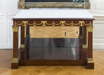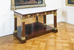 Spiegelkonsole auf längsrechteckiger Sockelplatte mit vorspringenden quadratischen Ecken. Darauf und an der Rückseite erheben sich vier hohe Pfeiler mit bronzenen akanthusblattverzierten Basen und Kapitellen. Rückwand verspiegelt. Hohe glatte Zarge, auf drei Seiten mit einem bronzenen Fries versehen: vier bzw. zwei (an den Seiten) geflügelte Mischwesen, die aus Akanthusblättern herauswachsen, im Wechsel mit fünf bzw. drei Kandelabern. Zwischen den Motiven hängende Blütengirlanden, die in den Händen der Mischwesen in Banderolen auslaufen. Vorspringende profilierte Deckplatte; Marmorplatte mit Einfassung ergänzt.