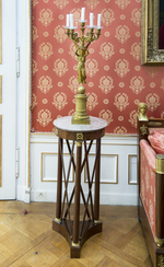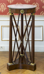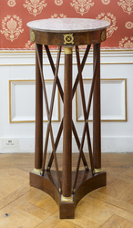 Beistelltisch auf 3-seitig eingezogener Sockelplatte. Drei hohe, schlanke Säulenbeine mit Bronzebasis und -kapitell. Die Basen mit ziseliertem Ornamentband und Blattfries, die Kapitelle mit Blütenfries und breitem ziseliertem Feld. Zwischen den Beinen x-förmige Verstrebungen mit aufgesetzten Bronzescheiben. Glatte Zarge mit Bronzebeschlägen: über dem Ansatz der Beine je ein Blütenkranz mit gekreuzten, bändergeschmückten Pfeilen, dazwischen Medusenhaupt in Strahlenkranz. Vorkragende kreisrunde Deckplatte aus bräunlich-grauem Marmor. Auf der Unterseite der Deckplatte nummeriert: II