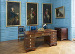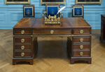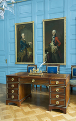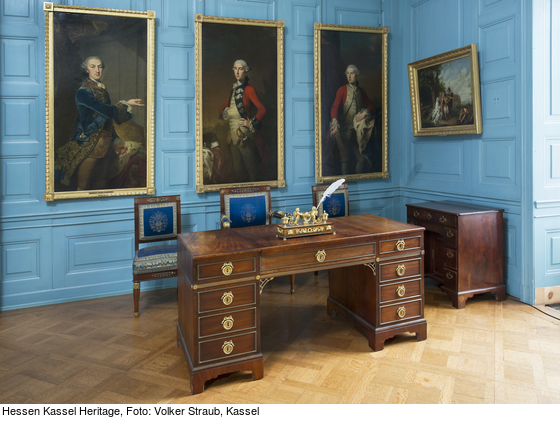Das Stück wird der Roentgen-Manufaktur zugeschrieben, ist aber in den schweren Formen keinem Schreibtisch aus der Roentgen Werkstatt dieser Zeit direkt vergleichbar, sondern eher englischen Möbeln, z.B. Bibliotheksschreibtischen mit zwei seitlichen Piedestalen und einem mittleren Fußkasten. Ein zumindest im Aufbau, wenn auch nicht in den Formen ähnliches Stück stellt der um 1760 datierte Roentgen Schreibtisch Inv.Nr. 2.3.29 dar.