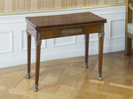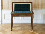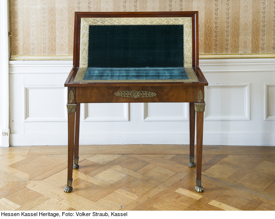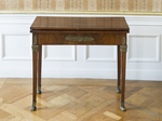 Aufklappbarer Spieltisch auf 4 konisch zulaufenden Vierkantbeinen. Die Füße als bronzene Löwentatzen, darüber ein Blattkranz aus Bronze. Am Ansatz zur Zarge Blattkapitel aus Bronze. Glatte, an den Ecken flach abgesetzte Zarge mit Bronzeappliken aus hochgestellten Palmetten. An den Längsseiten mittig Bronzebeschlag aus einem Weinlaubkranz im Rund, flankiert von je zwei seitlichen Blattstäben mit Efeu. Leicht überstehende, rechteckige, zum Quadrat aufklappbare Tischplatte. Die Oberfläche mit dunkelgrünem Samt bezogen, der von einer Goldborte mit floraler Motivik gerahmt wird. Zum Aufklappen die hinteren Beine beweglich mit faltbarer, durch ein Gelenk verbundener Zarge. Die Ornamentik der Blattkapitelle leicht abweichend vom Gegenstück Inv.Nr. SM 2.2.593.