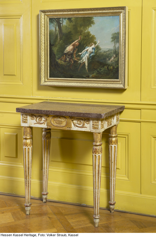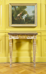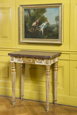 Weiß - gold gefaßter Konsoltisch. Kannelierte Rundbeine, nach unten leicht konisch zulaufend mit abgesetzter, länglicher Fußzone. Die Kanneluren im unteren Teil ausgefüllt und in stark stilisiertem Blattstab endend. Am Zargenansatz kapitellförmig gestaltet, ein Wulstring trennt einen nach unten weisenden Blattkranz von einem gegenläufig gestalteten. Gerade Zarge mit vertieften Feldern, in die auf der Vorderseite ein Rankenfries, an den Seiten ein Akanthusblattmotiv eingesetzt ist. Die Ecken mit länglichen, gerahmten Feldern, in die Rosetten eingesetzt sind. Auf der Vorderseite aufgesetztes längliches Feld, an den oberen Ecken zwei Eckrosetten, denen unten je zwei Guttae entsprechen. Mittig in vertieftem ovalem Feld flache antikisierende Deckelschale. Rechteckige Deckplatte aus rötlichem, weiß gesprenkeltem Marmor.