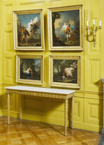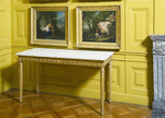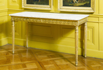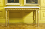Geschnitzter und vergoldeter Konsoltisch. Kannelierte Rundbeine, nach unten leicht konisch zulaufend mit abgesetzter Fußzone. Am Zargenansatz eingezogen und profiliert mit aufgelegtem Blatt- und Blütenfries. Gerade Zarge mit vertieften, gerahmten Feldern, in die ein Wellenband- und Eichenblattfries eingelegt ist. Die Ecken mit längsrechteckigen, gerahmten Feldern und applizierten Rosetten. Zur Deckplatte hin leicht vorkragender Lorbeerblattfries. Deckplatte aus weißem, grau geädertem Marmor.
