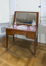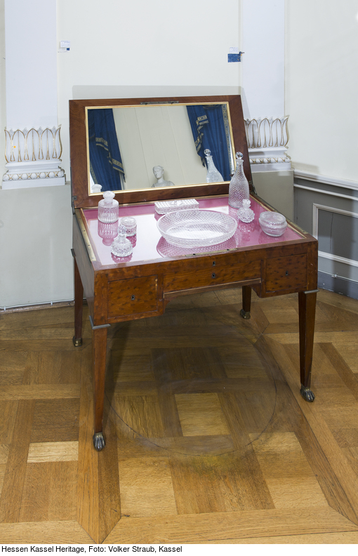 Toilettetisch mit verstellbarem Spiegel. Schreibtischähnlicher Unterbau mit konisch zulaufenden Vierkantbeinen, die in Tiertatzen aus Messing enden. Beine zur Zarge hin durch kleine Kaptitellplatten abgesetzt. Zwei seitliche und eine flache mittlere Schublade über dem angedeuteten Knieloch mit flach ausgeschnittenen Eckzwickeln.
