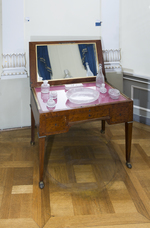 Mahagoni, Vogelaugenahorn? , teils vergoldet, Eiche, Messing, Spiegelglas, Glas, Seide, rot |