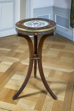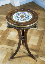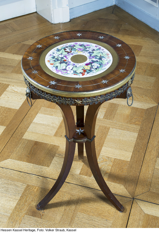 Kleiner Tisch auf 3 Beinen, evtl. Blumentisch. Vierkantige, C-förmig gebogene und leicht verjüngte Beine mit abgesetzter Fußzone. Die Beine in halber Höhe durch scheibenformiges Mittelbrett verbunden mit aufgesetzten, reliefierten Bronzleisten. Die Oberseite des Mittelbrettes mit Perlmutteinlage in Form eines 6-zackigen Sterns. Das obere Ende der nach außen gebogenen Beine mit Löwenkopfmaske, im Maul Ring haltend. Glatte Zarge mit umlaufendem Efeurankenfries, unterbrochen von Rosetten und 8-zackigen Bronzesternen im Wechsel. Leicht vorkragende Platte, der Rand mit vergoldeter und kleinteilig ornamentierter Bronzeleiste. Die Platte rund mit leicht vertiefter Mitte. Die Randzone mit 12 eingelegten, 6-zackigen Perlmuttsternen, verbunden durch Bandstreifen mit Intarsienmuster. In der Mitte eingelassene Porzellanplatte mit aufgemaltem, breitem Kranz aus verschiedensten Blumen und Blättern. Die Mitte goldfarbig, einen Blütenstern im Kreis darstellend, der Rand mit leicht erhabenem Rankenmuster, goldfarbig auf goldfarbigem Grund.