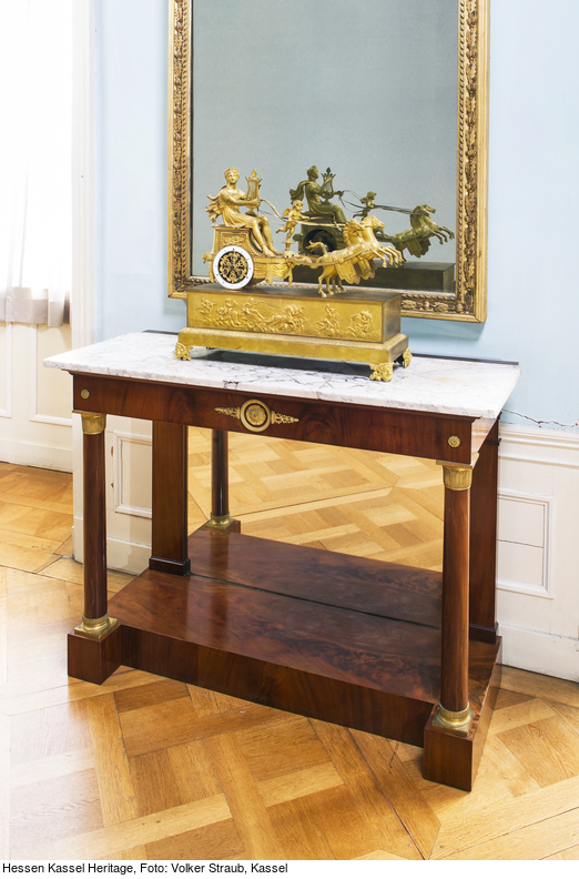 Hohe, rechteckige Sockelplatte, vorne seitlich vorspringend als Sockel für die Säulen der Frontseite. Die Säulen mit Bronzekapitellen und -basen, Reliefdekor in Form stilisierter, langgezogener Blätter. Rückwand mit Spiegeleinsatz zwischen flachen Pilastern mit einfach abgesetzten Basen und Kapitellen. Glatte Zarge mit Bronzebeschlägen auf der Vorderseite: seitlich über den Säulen kleine 8-blättrige Rosetten, mittig 8-blättrige Rosette in Kreisform mit seitlich angesetzten, von Ranken umschlungenen Thyrsosstäben. Vorkragendes Gesims mit einfachem Karnies zur Aufnahme der Deckplatte aus hellem, grau geädertem Marmor. Platte auf der Unterseite beschriftet: 189 a / 6.