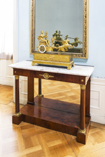 Mahagoni, Eiche, Nadelholz, Bronze, vergoldet, Spiegelglas, Marmor, hell, grau geädert |