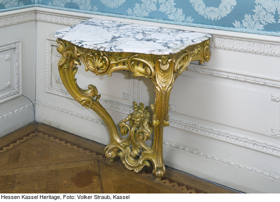 Spiegelkonsole, reich geschnitzt, gefaßt und vergoldet. Symmetrischer Aufbau. Zwei, in zwei C-Schwüngen nach unten geführte Beine, stark profiliert und mit Blattwerk versehen. Unten zwischen den Beinen Voluten und Akanthusblattwerk, darauf Blütenbekrönung. Stark geschwungene Zarge mit stellenweise durchbrochen gearbeitetem Muschelwerk, Blattranken und Voluten, mittig hochgestelltes Blatt in Kartusche. Überstehende, der Form des Konsoltisches angepasste und profilierte weiße Marmorplatte mit grauer Äderung.