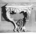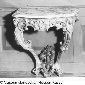 Spiegelkonsole, reich geschnitzt, gefaßt und vergoldet. Symmetrischer Aufbau. Zwei, in zwei C-Schwüngen nach unten geführte Beine, stark profiliert und mit Blattwerk versehen. Unten zwischen den Beinen Voluten und Akanthusblattwerk, darauf Blütenbekrönung. Stark geschwungene Zarge mit stellenweise durchbrochen gearbeitetem Muschelwerk, Blattranken und Voluten, mittig hochgestelltes Blatt in Kartusche. Überstehende, der Form des Konsoltisches angepasste und profilierte weiße Marmorplatte mit grauer Äderung.