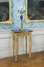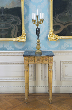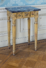 Vergoldeter Wandtisch auf konischen kannelierten Rundbeinen mit abgesetzten blattverzierten Füßen. Blattkapitell, oben und unten Wulstringe mit Lorbeerblattgirlande bzw. Blattfries. Auf drei Seiten profilierte Zarge, an den Ecken hervorgehobene hochrechteckige Felder mit applizierten geschnitzten Rosetten. Zargenfront mit hervorgehobenem Mittelfeld, darauf geschnitztes Rosenblütengebinde. Die seitlichen Frontfelder und die Zargenseiten zeigen applizierte Blütengirlanden an Bändern und Schleifen. Vorkragende grau-weiß-grün geäderte Marmorplatte.