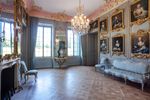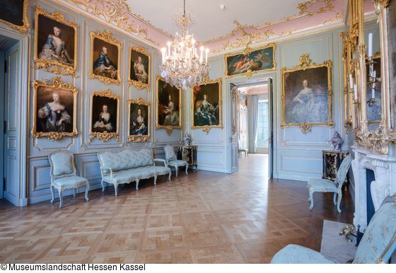 Teil einer 7-tlg. Garnitur. Geschweifte Grund- und Aufrisslinie. Zurückhaltend geschnitzte Mittel- und Eckstücke. Hellblauer Anstrich und neue Vergoldung.