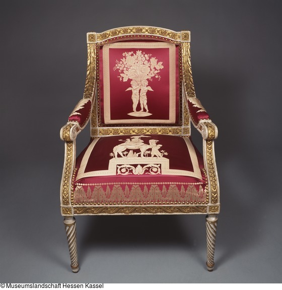Einer von vier Armlehnsesseln mit geschnitztem, weiß und gold gefaßten Buchenrahmen. Über Kugelfüßen gedrehte Kanneluren an den konischen Säulenbeinen. Kehle am Übergang zur geraden Zarge, die mit einem Wellenband mit Kelchblättern verziert ist. Die Stützen der Armlehnen mit Schuppenmuster, der obere Teil der Lehnen mit Akanthusschnitzerei. Der Rahmen der Rückenlehne ist in der Mitte etwas hochgezogen und trägt ein Ornament aus verschlungenen Wellenbändern mit Rosetten. Sitz und Rückenlehne gepolstert und 1978 mit nachgewebtem Seidenlampas bezogen. Der Bezugsstoff entspricht der Wandbespannung Kat.Nr. 56 (Entwurf: Manufaktur Pernon, Lyon). Zwei weitere Armlehnstühle dieser Serie (2.1.838; 2.1.839) sind im Vorrat vorhanden. Sie sind wie ein dazugehöriger Ofenschirm (Wthal 54/7) noch mit der ursprünglichen, nicht chinoisen Seide bezogen. Zugehörig zu Inv. Nr. 2.1.841, 2.1.842 u. 2.1.843