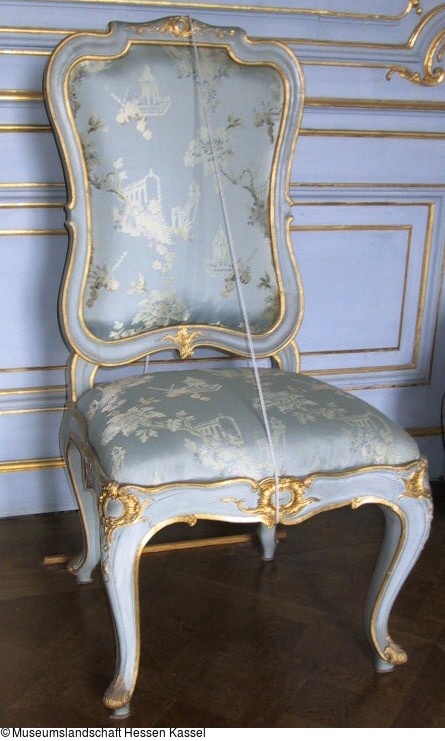 Rücklehne in geschwungener Schildform. An der Stelle der stärksten seitlichen Einschnürung schwingen die begrenzenden Rundprofile nach außen u. brechen ihre Bewegung ab. Rücklehne u. Sitz in alter Art eingesetzt.