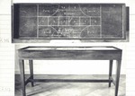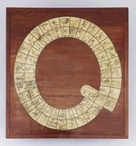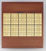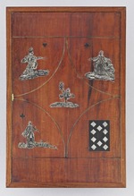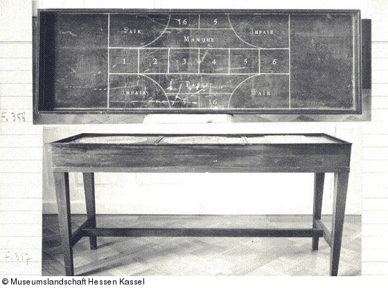 Viel-Spiel-Tisch mit 14 verschiedenen Einsatzplatten für Spiele. Vierkantbeine, nach unten leicht verjüngt. Die Beine durch doppelt T-förmige Strebe verbunden. Vertiefter Tischkasten, der Boden mit grünem Leder ausgelegt. Darauf durch Goldprägungslinien abgeteilte Felder eines weiteren Spiels: Pair et Impair. Wahrscheinlich aus der ersten Einrichtungszeit.