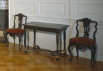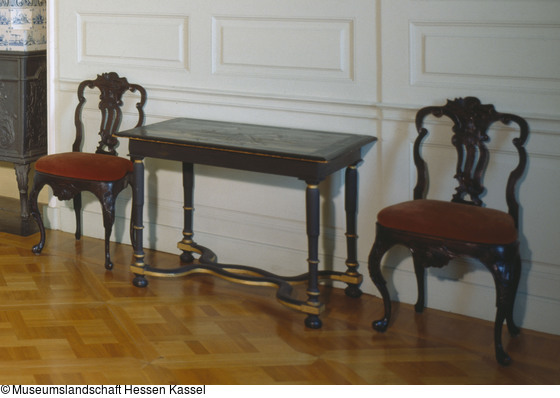 Rechteckige Tischplatte auf Untergestell mit gedrechselten Beinen, die oberhalb der Kugelfüße durch doppelt geschwungenes Kreuz verbunden sind. Gestell mit gerader, dreiseitig furnierter Zarge, schwarz lackiert, Kanten und Profile z.T. mit Gold abgesetzt. Platte mit Eichenrahmen, in den eine mit Gold- und Kupferstreutechnik lackierte Platte eingelassen ist. Diese wie der Rahmen mit Einlagen aus asiatischem Lack in zweiter Verwendung verziert: verschiedene collagierte Landschaftsdarstellungen mit Pfahlhäusern und unterschiedlichen Baumarten; großes Gänsepaar zwischen Bambus; auf dem Rahmen Menschen- und Tierdarstellungen. Die gesamte Platte ist stark mit europäischem Lack überarbeitet.